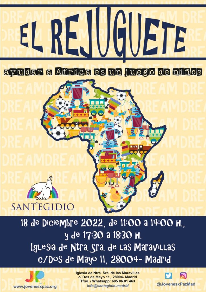 Por eso, a las puertas de la Navidad, vuelve el «Rejuguete», que con mucha ilusión organizan los Jóvenes por la Paz y los niños de las tres Escuelas de la Paz de la Comunidad de Sant’Egidio en Madrid, al igual que en muchas ciudades de Italia y de Europa. El rejuguete madrileño será este Domingo 18 de diciembre en horario matutino (11h a 14 hrs) y vespertino (de 17.30 a 18.30 hrs) en la Iglesia Nuestra Señora de las Maravillas (Calle Dos de Mayo, 11).