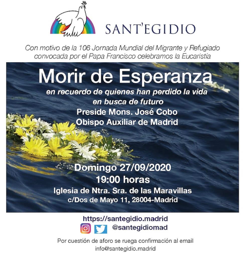 Coincidiendo con la 106ª Jornada Mundial del Migrante y Refugiado, la Comunidad de Sant’Egidio en Madrid celebra el próximo Domingo 27 de Septiembre a las 19hrs. en la Iglesia Nuestra Señora de las Maravillas, la Eucaristía «Morir de Esperanza», que estará presidida por el Obispo Auxiliar de Madrid, Mons. José Cobo, y que contará con la participación musical del coro de la asociación Karibu.