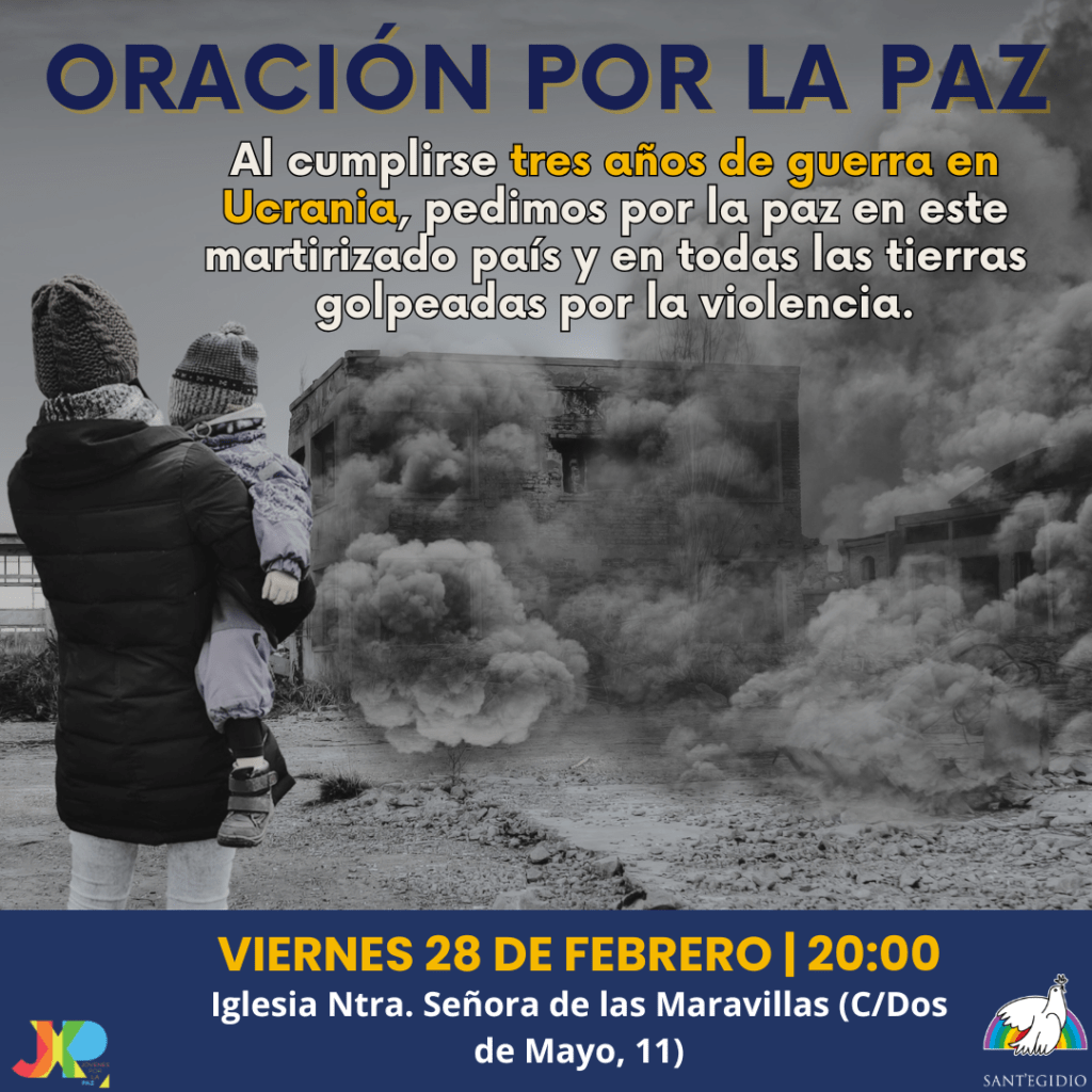 Cuando se cumplen tres años del inicio de la guerra a gran escala en Ucrania, la Comunidad de Sant’Egidio sigue pidiendo el don de la paz en este martirizado país, donde los combates y los bombardeos siguen provocando víctimas y destrucción de proporciones inimaginables. Lo hacemos como cada último viernes de mes con una oración comunitaria a las 20h en la Iglesia Ntra. Señora de las Maravillas.