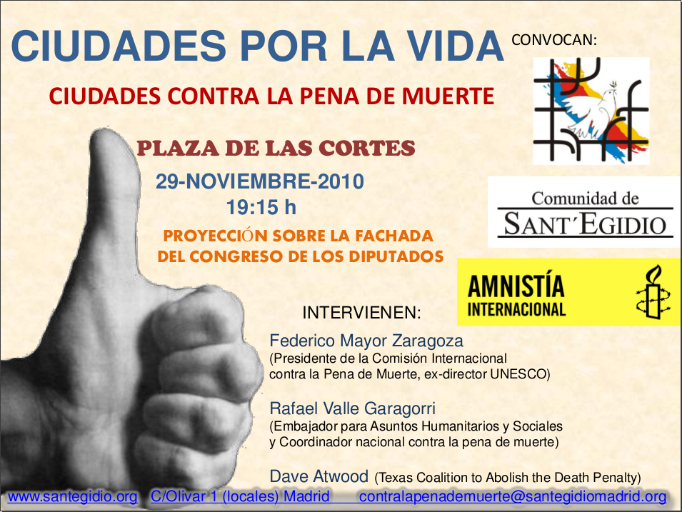 Vídeo del Acto Ciudades por la Vida en Madrid. Intervienen: Federico Mayor Zaragoza, Rafael Valle Garagorri, Dave Atwood, Carlos Busto y Esteban Beltrán httpv://www.youtube.com/watch?v=OsJCBXlBFWk