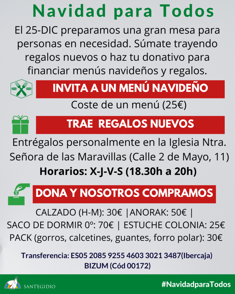 El 25 de diciembre celebraremos la buena noticia del nacimiento de Jesús con las tradicionales Comidas de Navidad a las que invitamos a los amigos con quienes compartimos a lo largo del año: personas sin hogar, migrantes y refugiados, familias de los barrios, niños de las Escuelas de la Paz y ancianos solos. También con todas las personas que a lo largo del año nos acompañáis en este camino en los diferentes servicios a los más vulnerables.
