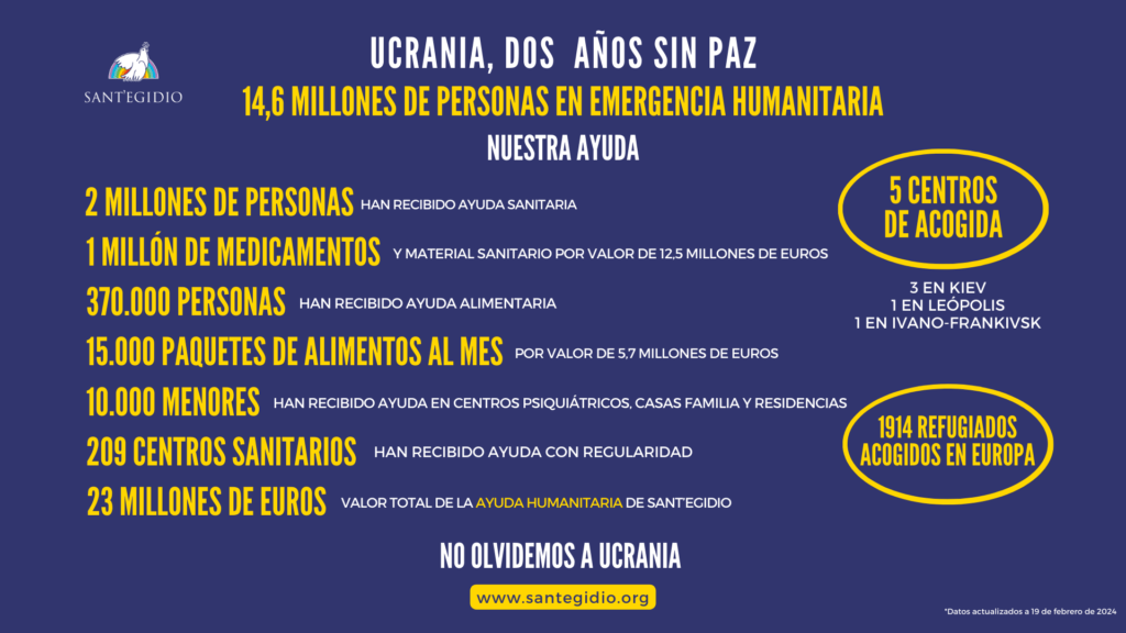 La Comunidad de Sant’Egidio tiene una presencia de 30 años en Ucrania, con comunidades formadas por ciudadanos ucranianos que, además de vivir el sufrimiento, el miedo y las incomodidades que son comunes a toda la población, han creado una extensa red de ayuda humanitaria que en dos años ha llegado a unas 370.000 personas de todo el país, incluidas las zonas meridionales y orientales más expuestas a las acciones bélicas. Todo ello se ha podido hacer gracias a una cadena de solidaridad que empieza en Italia y en otros países europeos y que no se puede interrumpir mientras dure el conflicto.