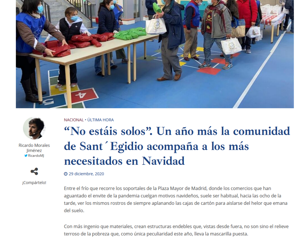 Tíscar Espigares, responsable de la Comunidad de Sant’Egidio en Madrid comparte con la Revista Ecclesia la experiencia de una «Navidad para Todos», en la que repartimos más de mil menús calientes y regalos nuevos a personas necesitadas: sin techo, familias, ancianos solos, extranjeros. «Teníamos claro que la navidad había que seguir viviéndola con nuestros amigos más pobres. Nos hemos adaptado a las circunstancias para seguir ofreciendo ayuda y compañía».