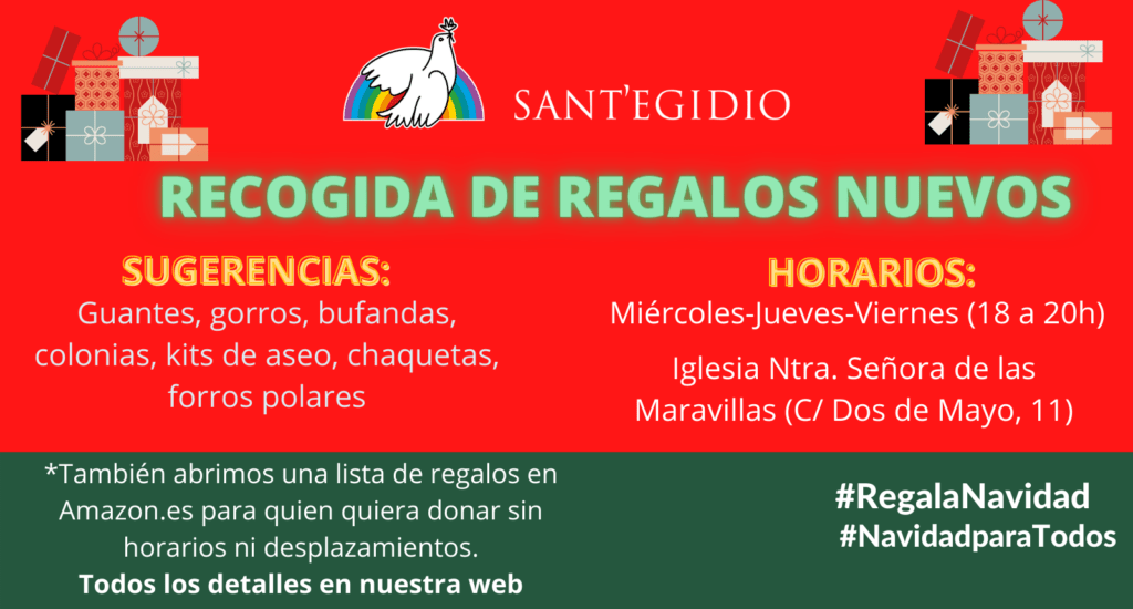 Recibimos las donaciones de regalos (jerseys, forros polares (hombre-mujer), guantes, gorros, bufandas, colonias, artículos de aseo) en la Iglesia Ntra. Señora de las Maravillas (C/Dos de Mayo, 11) los miércoles, jueves y viernes de 18 a 20hrs. Además, hemos abierto una lista de compra en Amazon para facilitar a las personas que quieran evitar desplazamientos y horarios. Pincha aquí para ACCEDER A LA LISTA