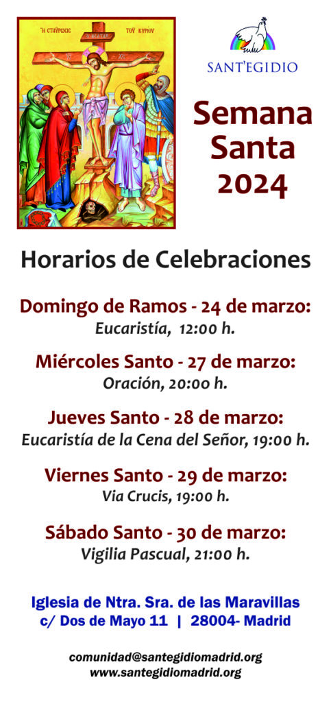 En un momento de tantas «cruces» para los que más sufren a causa de la guerra, la crisis económica y la soledad, caminamos juntos hacia la Pascua de Resurrección porque sabemos que el mal nuca tiene la última palabra. Te invitamos a acompañarnos esta Semana Santa 2023 en la Iglesia Ntra. Señora de las Maravillas. A continuación el horario de celebraciones: Artículo publicado por la Comunidad de Sant’Egidio de Madrid. Semana Santa 2023 con Sant’Egidio en Madrid [Horarios de celebraciones] https://sleepy-black.85-214-195-191.plesk.page/?p=14440