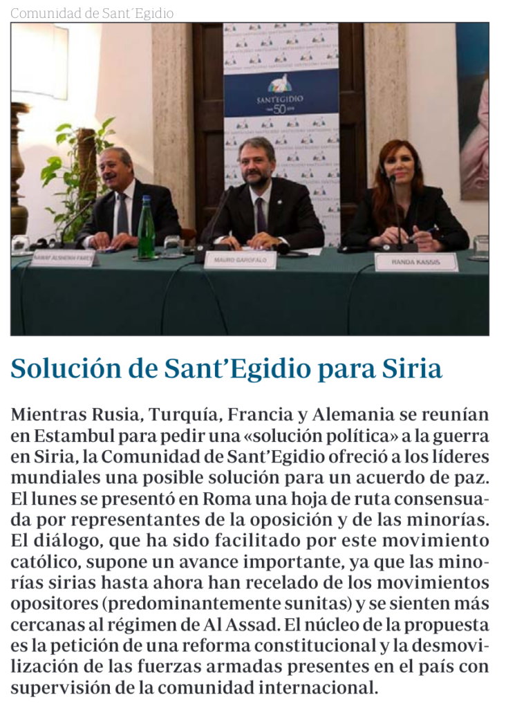 Para profundizar sobre el trabajo por la Paz de Sant’Egidio en Siria se puede acceder a este artículo de 29/07/2012 del periódico The Guardian en este enlace